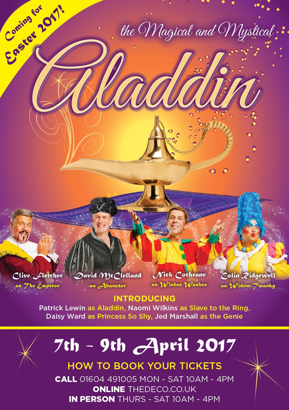 Enjoy a spectacular pantomime extravaganza Aladdin , here at the Deco Easter 2017 Packed with sensational special effects, a magical flying carpet ride, laugh-out-loud comedy, and an Aladdin’s cave of lavish sets and costumes, this year’s pantomime is everything you could wish for!