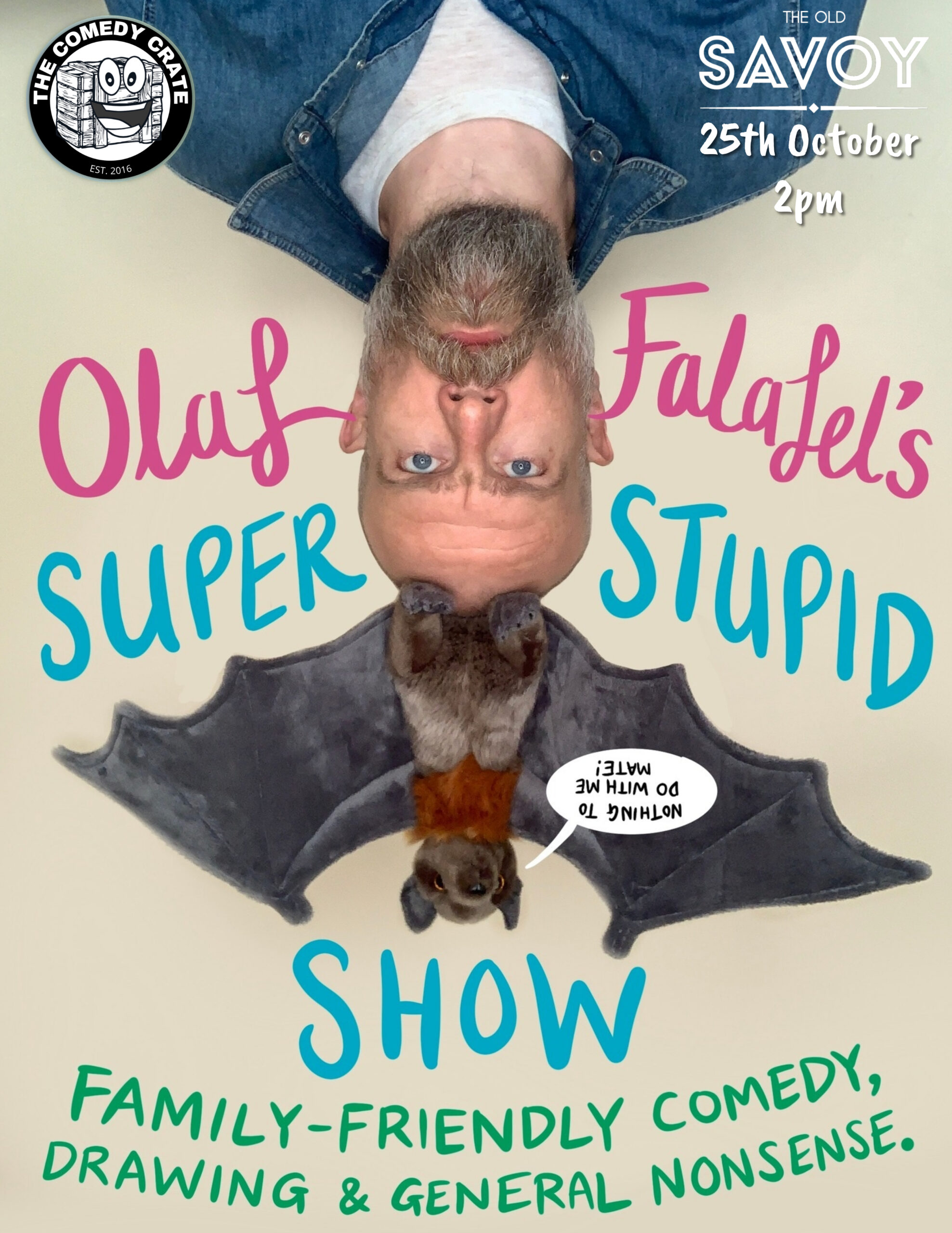 JOIN COMEDIAN AND CHILDREN’S AUTHOR OLAF FALAFEL FOR AN HOUR OF REALLY STUPID KIDS COMEDY PLUS A DRAWING LESSON AND POSSIBLY SOMETHING THAT INVOLVES FISHING, DUCKS, BUMBAGS AND SAUSAGES. FAMILY-FRIENDLY FRIVOLITY THAT WILL LEAVE YOU FEELING A LOT LESS INTELLIGENT THAN WHEN YOU WALKED IN.
